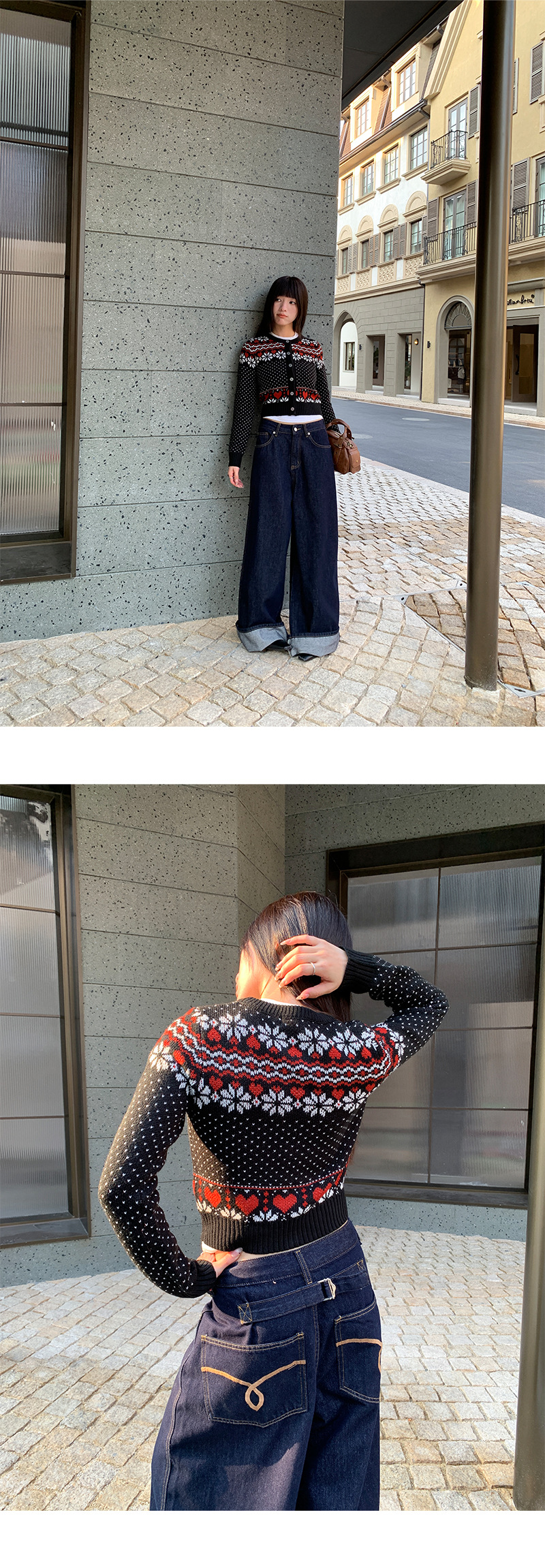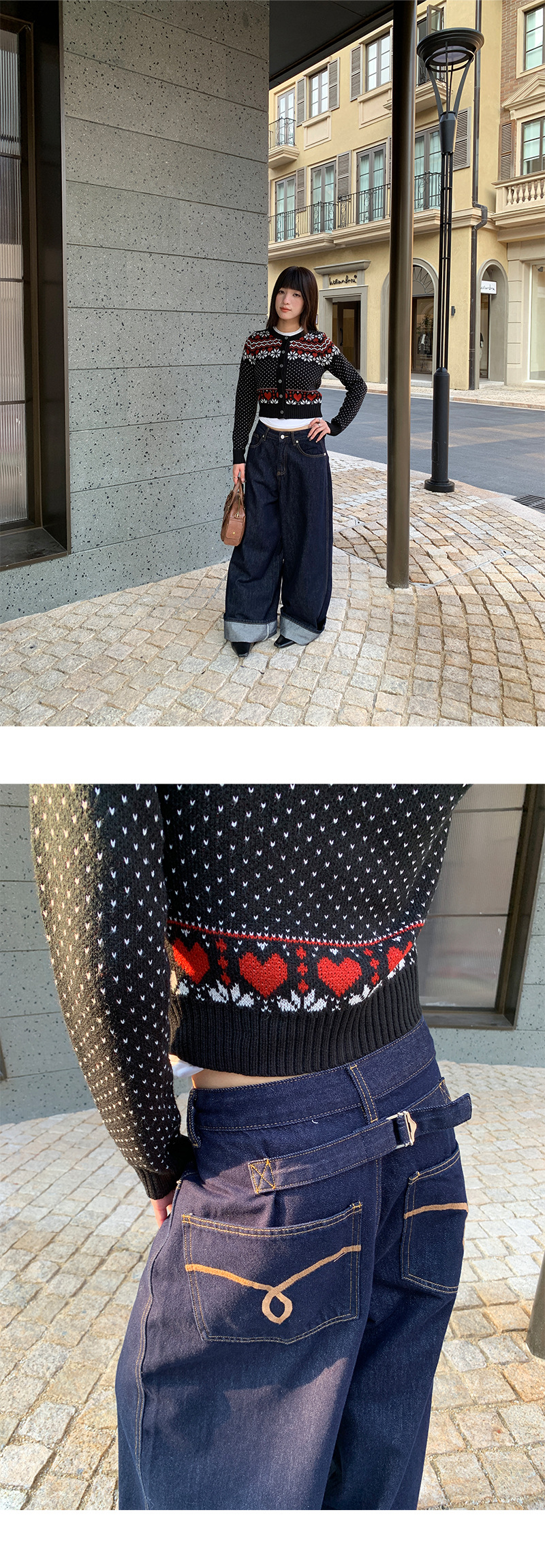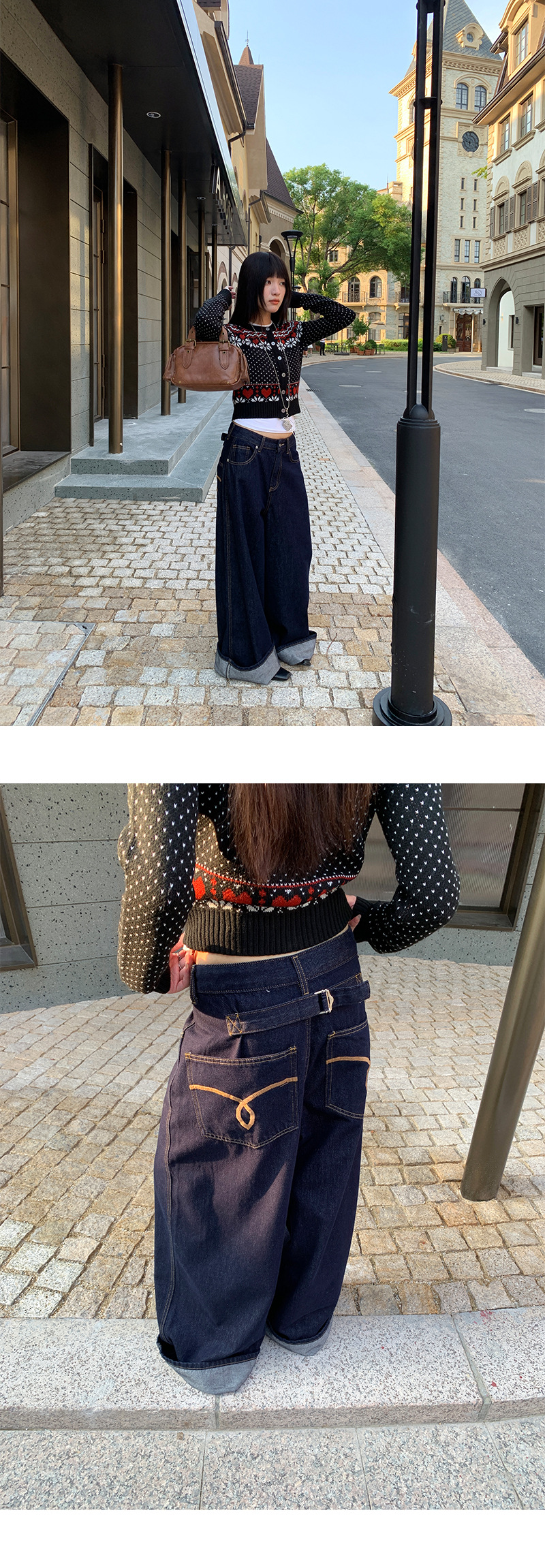 Korean-inspired design: Modern wide-leg jeans with decorative fake belt detailing for a stylish look.