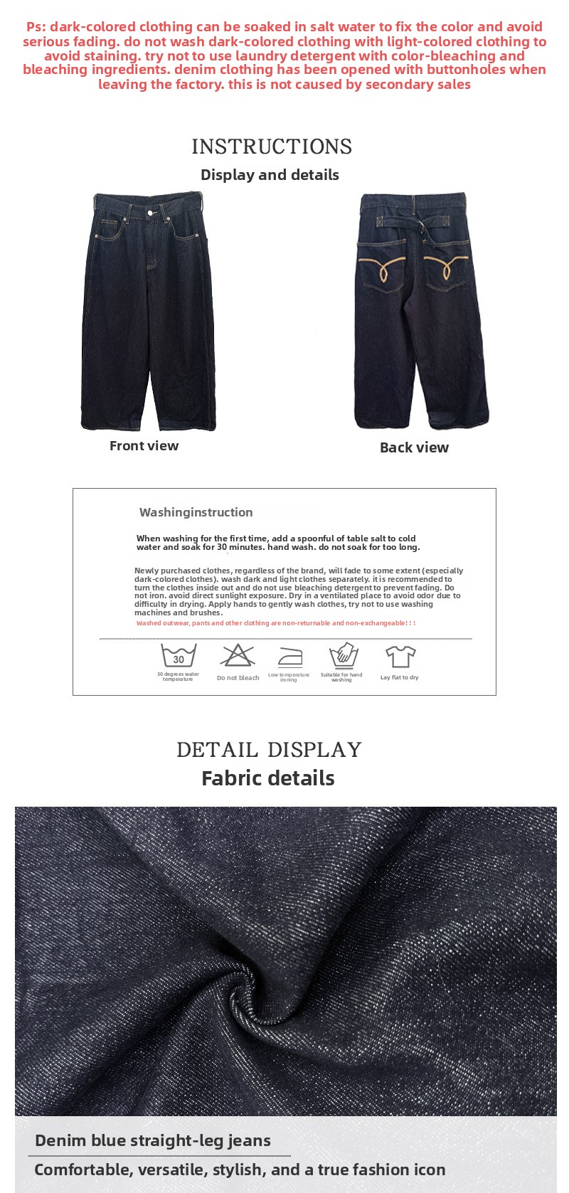 Durable denim: Made from cotton denim fabric with washable, vintage, and splicing elements.